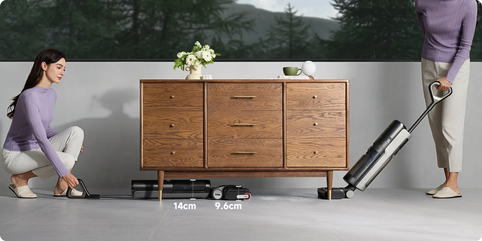 *180°, 14cm, 9.6cm: The entire body of the vacuum cleaner can reach spaces as low as 14cm and the brush head as low as 9.6cm. Based on our in-house lab data.